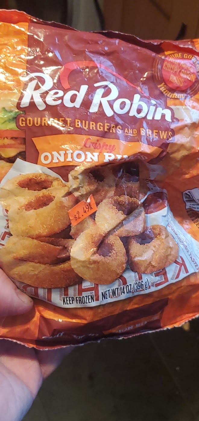 This was the first Red Robin product I've ever consumed, and I think I did it dirty. See, it got kind of forgotten at the bottom of our cube freezer for months, maybe years. And when I finally put it them the toaster oven on a recent burger night, all the breading fell off the onions, combining an unpleasant mouthfeel with the taste of freezer burn. Ate every bit, like a punishment.
