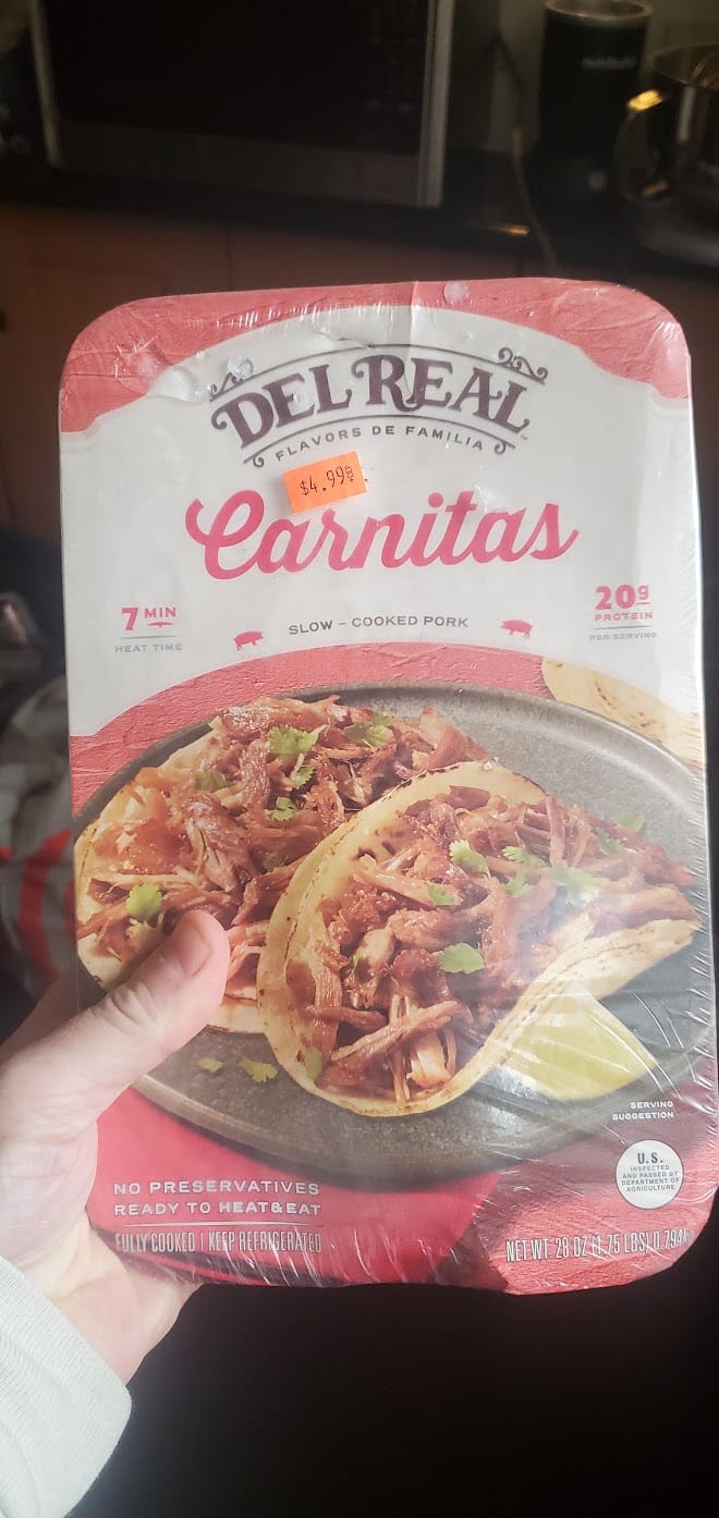 Two pounds of perfectly cooked meat right here, no notes. The only modification I made was putting it in a hot skillet for ~5 minutes, for an extra touch of crisp. I bought 4 boxes - now we have a foundation for tacos and sandwiches until our hearts give out. (Darby do you want carnitas tacos say yes)