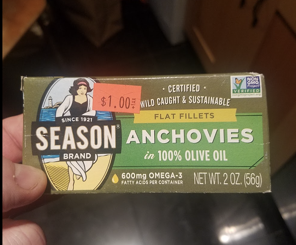 Anchovies used to be one of those foods like liver and prunes that were used as a punchline, a stand-in to represent "icky food." I guess people found them too salty or something. My mom used to brag that her palate must be more refined than the average joe, because she had a soft spot for anchovy pizza. All this to say, anchovies are chic now, along with all tinned fish, and I feel lucky that we snagged like 10 of these from the dollar store. Last night I used them in a kale Caesar salad: classic.