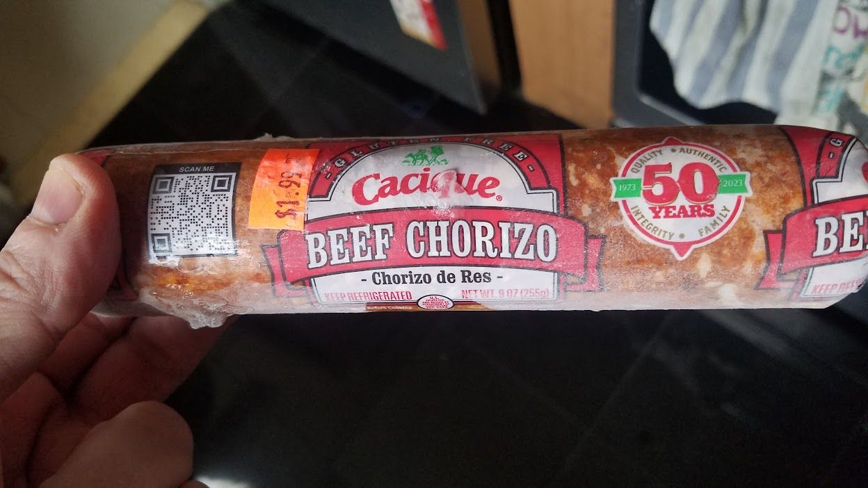 This chorizo is novel a) because it's beef and b) because it melts into a liquid when you put it in the pan. Reminds me of 'Nduja, that Italian import I know about because I'm bougie.