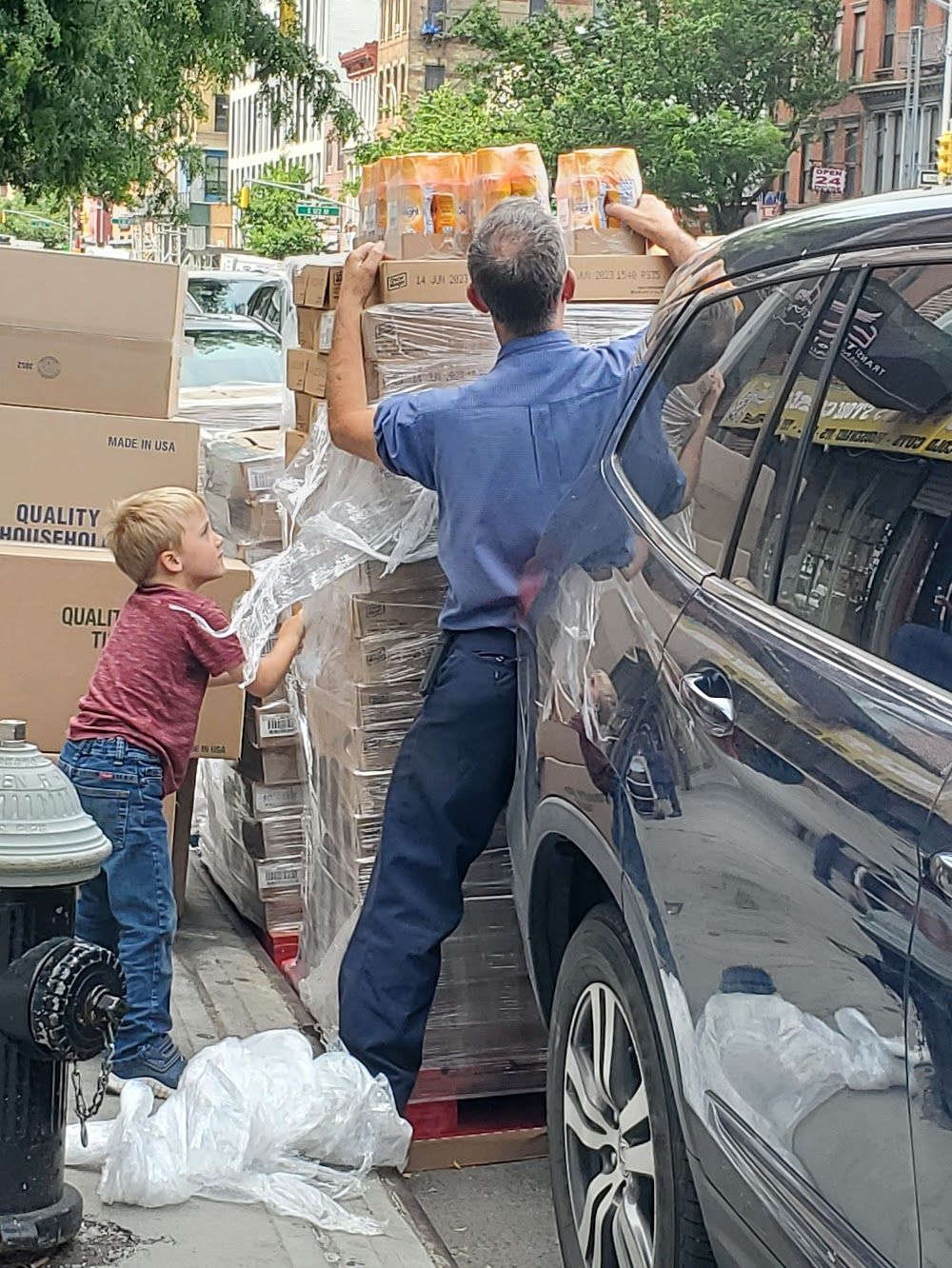 This might be child labor but it's pretty cute too. One of the store's Pennsylvania drivers has been bringing his son (grandson?) along on delivery trips this summer. It doesn't seem like the lad is actually laboring, but he clearly enjoys being part of the action. I believe they are unloading non-dairy creamer.