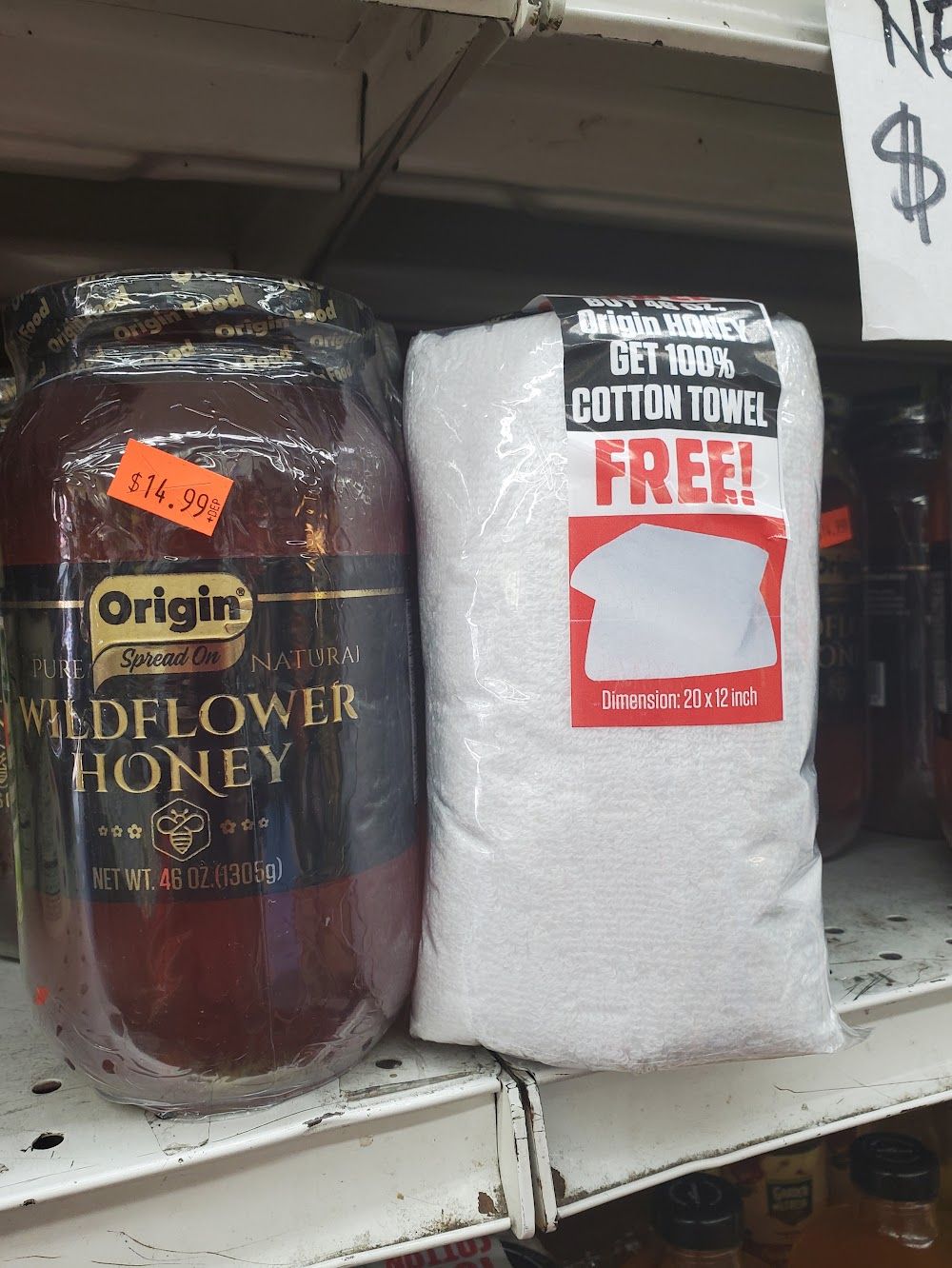 Why do you get a free towel with your honey? It's not even branded with the name of the company or anything. Abby was thoroughly delighted by this absurdist pairing. She keeps using it as a metaphor for things that don't belong together.