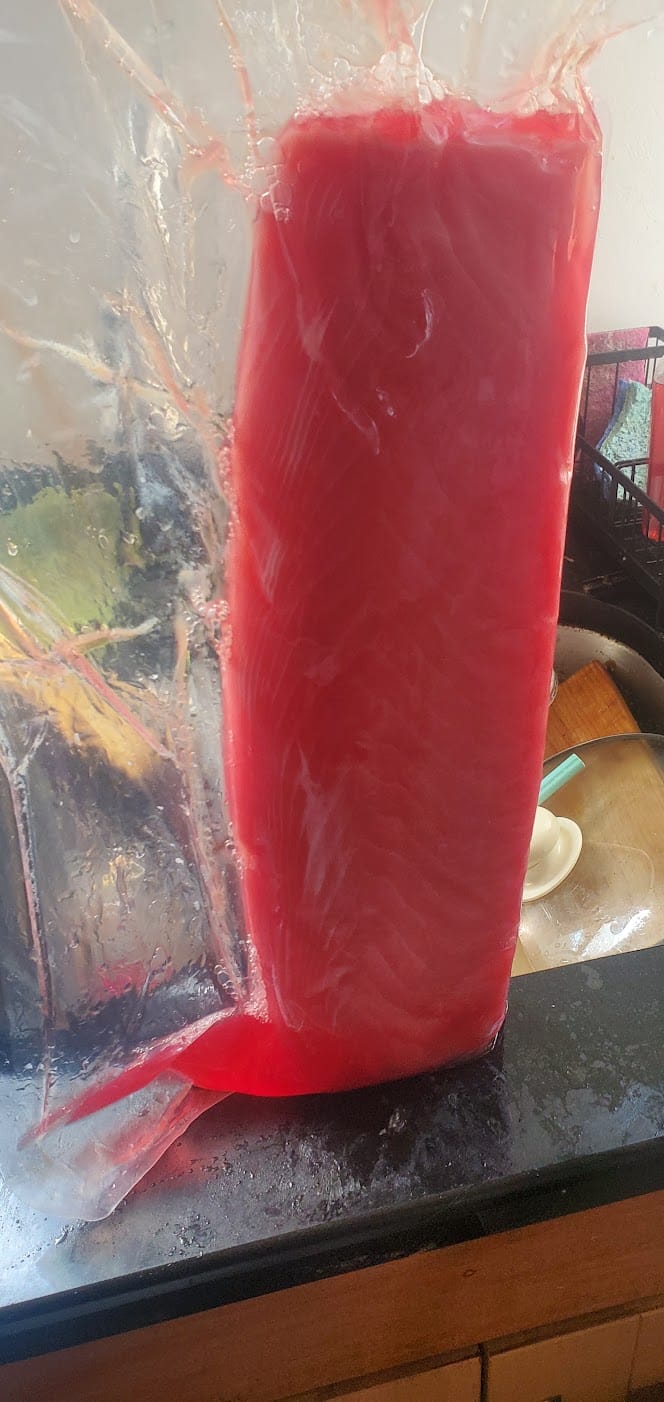 This is an enormous tuna loin, which only cost 12 bucks! I cut it into a bunch of individual steaks and put them all in the slow cooker, then made a killer Niçoise salad. We froze the rest, though, because tuna steaks are a bit toxic.