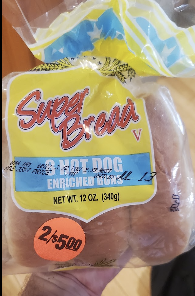 Don't be fooled by the sticker, these are only a buck. By no means are they super, or even all that good. But with a couple minutes of pan grilling they are a perfectly serviceable vehicle for my near-daily dogs.