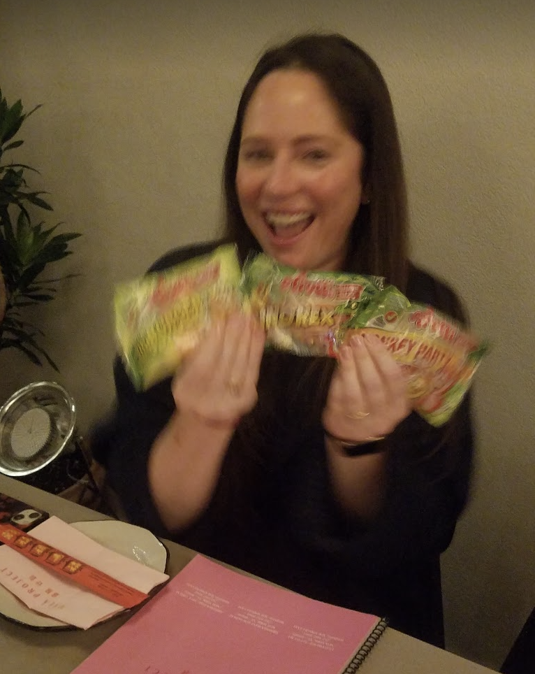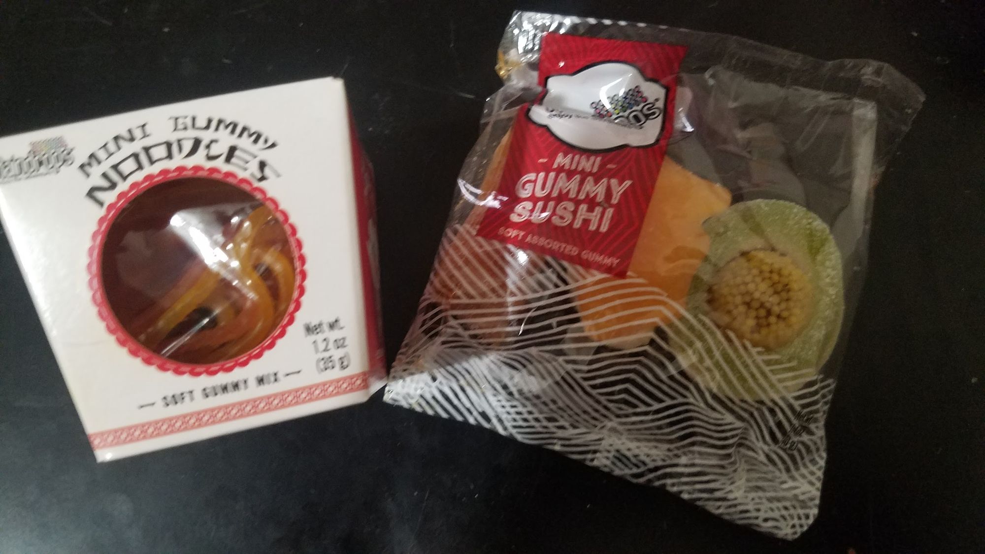 We've been giving the same gifts to houseguests and hosts for a couple of years now, a salvage-sourced pairing of gummi sushi and gummi noodles: