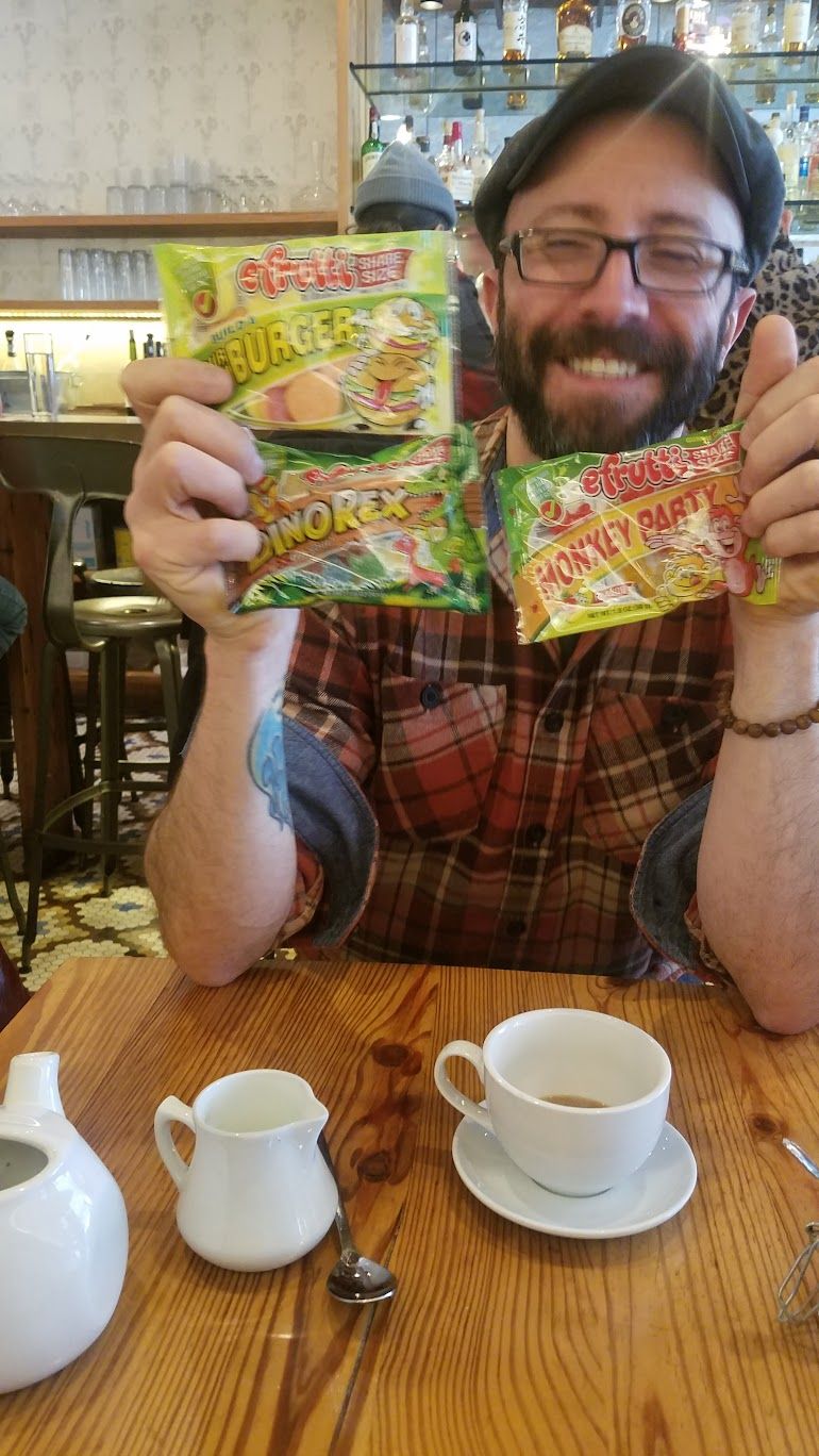 Rosa and Matthew got the last ones, however, so we're moving on. Now we shall distribute gummi monkeys, gummi dinos, and gummi build-your-own-burgers. Our first handsome customers, as photographed by Terry Richardson:
