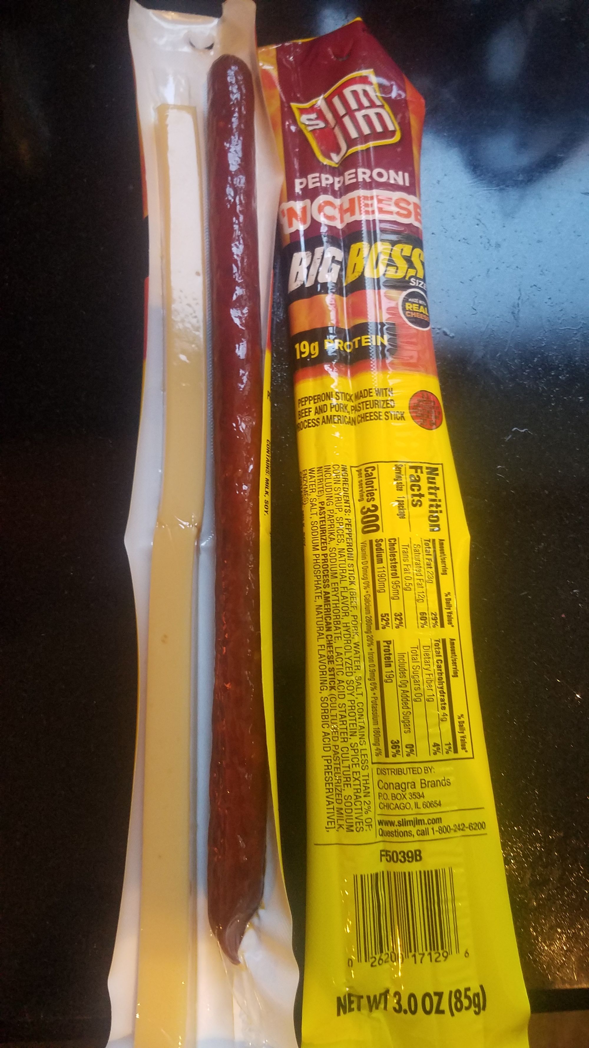 4. In January I purchased a box of "Big Boss" pepperoni and cheese snackpacks. Each pack includes shelf-stable rods of meat & cheese — this product is not right. Parmesan is basically the only cheese you don't have to refrigerate, and that's because it's loaded with weird additives. These cheese rods taste weird and tangy and unpleasant, so I tried feeding some to Lola, who threw up (true). This morning I shredded one for a breakfast quesadilla and it WOULDN'T MELT. Cursed: