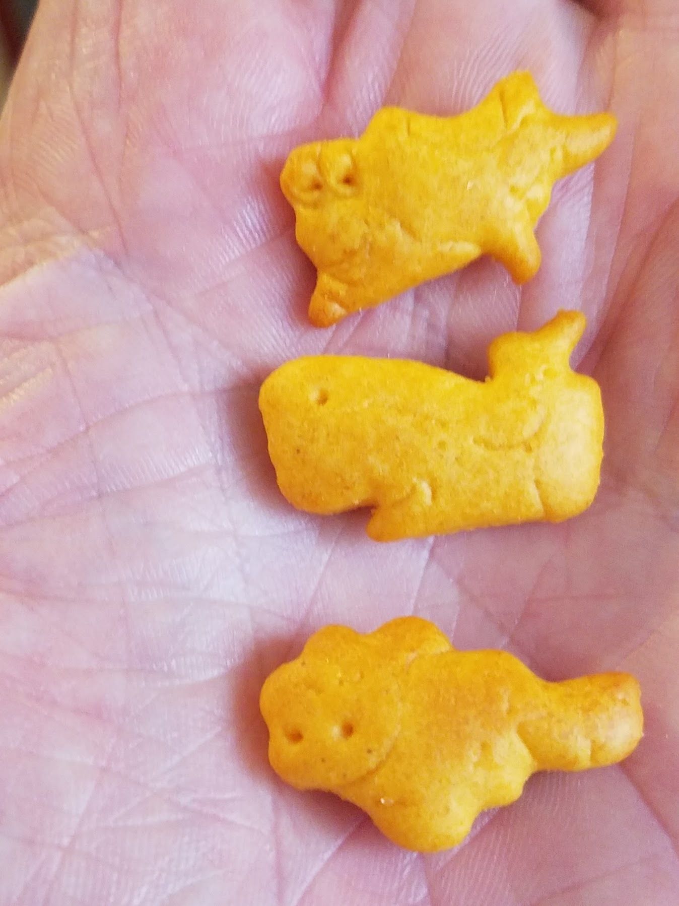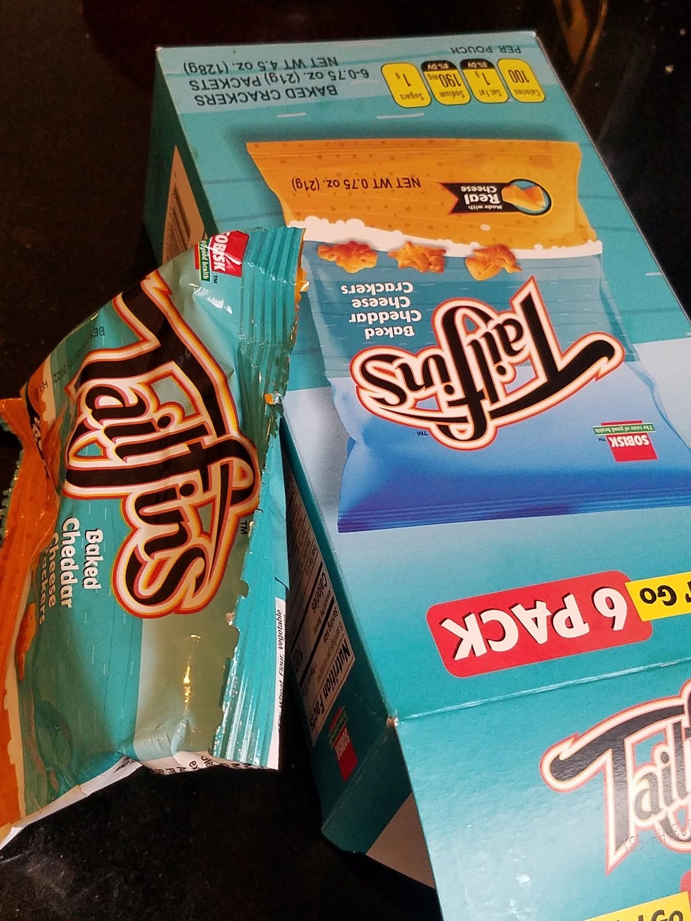 Tailfins! This Aldi product is obviously a Goldfish knockoff—better than the original, IMO. The core flavor is not the same, in a way that's difficult to articulate, though I discovered the secret ingredient may be paprika. We bought two Tailfins six-packs, and foolishly gave one to our friends who were about to make a road trip. Turns out this product is discontinued.