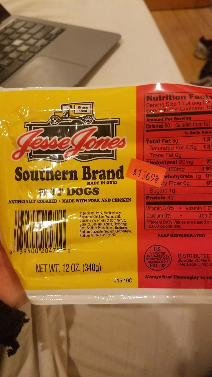 I've been suckered by novelty again — I fear these dogs will be inedible. I bought them because I misread "Southern Brand" as "Southern Style" which seemed like an unfamiliar wiener varietal. Apparently it just means they were produced in everyone's favorite Southern state: Ohio (?) I'm too lazy to go take another photo but these hot dogs have a very unhealthy pink hue, akin to bubble gum. Dammit, Jesse Jones.