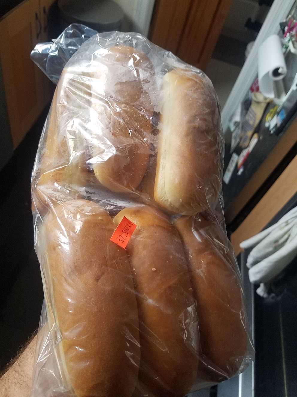 Unmarked bag of 12 fresh-baked hot dog rolls, perfect for my dog-forward lifestyle. Speaking of which, an update on those too-pink hot dogs I purchased recently — flavor was okay, but the texture was far too mushy. No snap. I've made a deal with myself: If I eat four of them, our dog can have the other four. (How is that actually a deal with myself?)