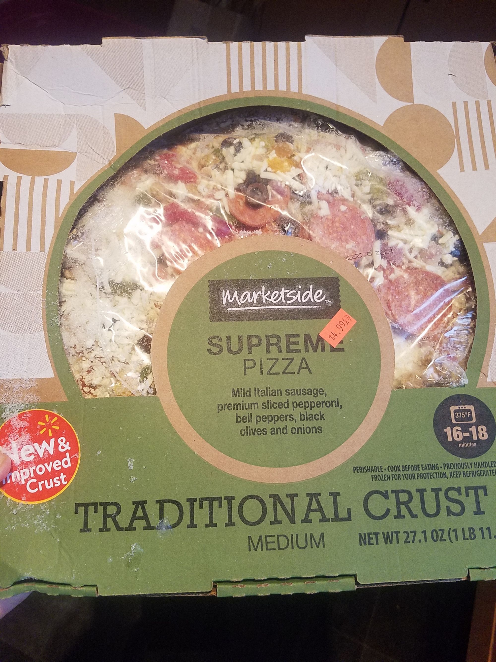 Tuesday was Abby's birthday so Mr. Romantic (me) popped in to the salvage grocer at lunchtime to see if they had any frozen pizzas. "Shopkeep, bring me your finest DiGiorno!" They had a sweet-looking supreme pizza from Marketside, WalMart's fancy store brand; Great Value is their generic line for the proles.