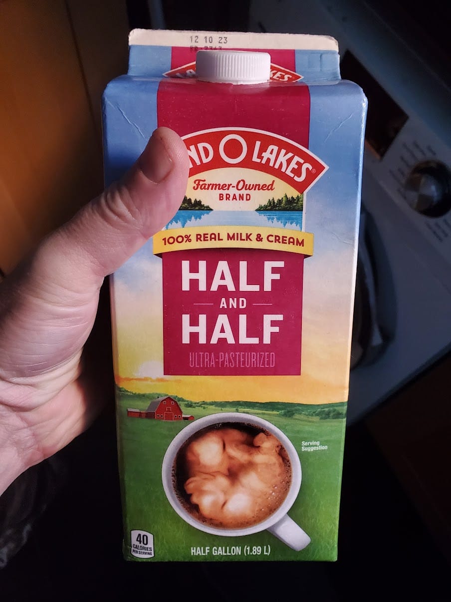 I was absolutely convinced this would spoil before we finished it: Who buys half and half so giant? Readers, we finished this one — and its replacement — long before spoilage arrived. My blood runs cream.