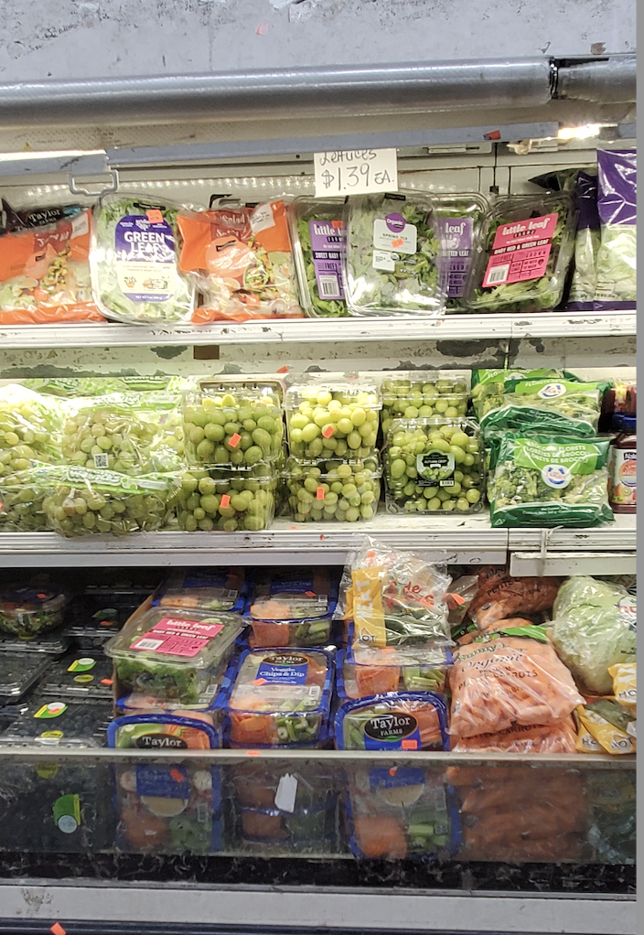 Something wild is happening at the surplus grocer right now. Early last week, they put out a bunch of bananas, blueberries, and blackberries. They don't typically traffic in fresh produce so this was notable, though not unprecedented. Then, over the course of the week, they started putting out more and more fresh produce: baby cukes, bags of seedless lemons, broccolini, serrano peppers, organic greens, veggie party platters, much more. It won't stop! There's a frantic energy to it, a race against spoilage. There isn't space for everything in the refrigerated cooler so they pile it into freestanding boxes in the middle of the store aisles.