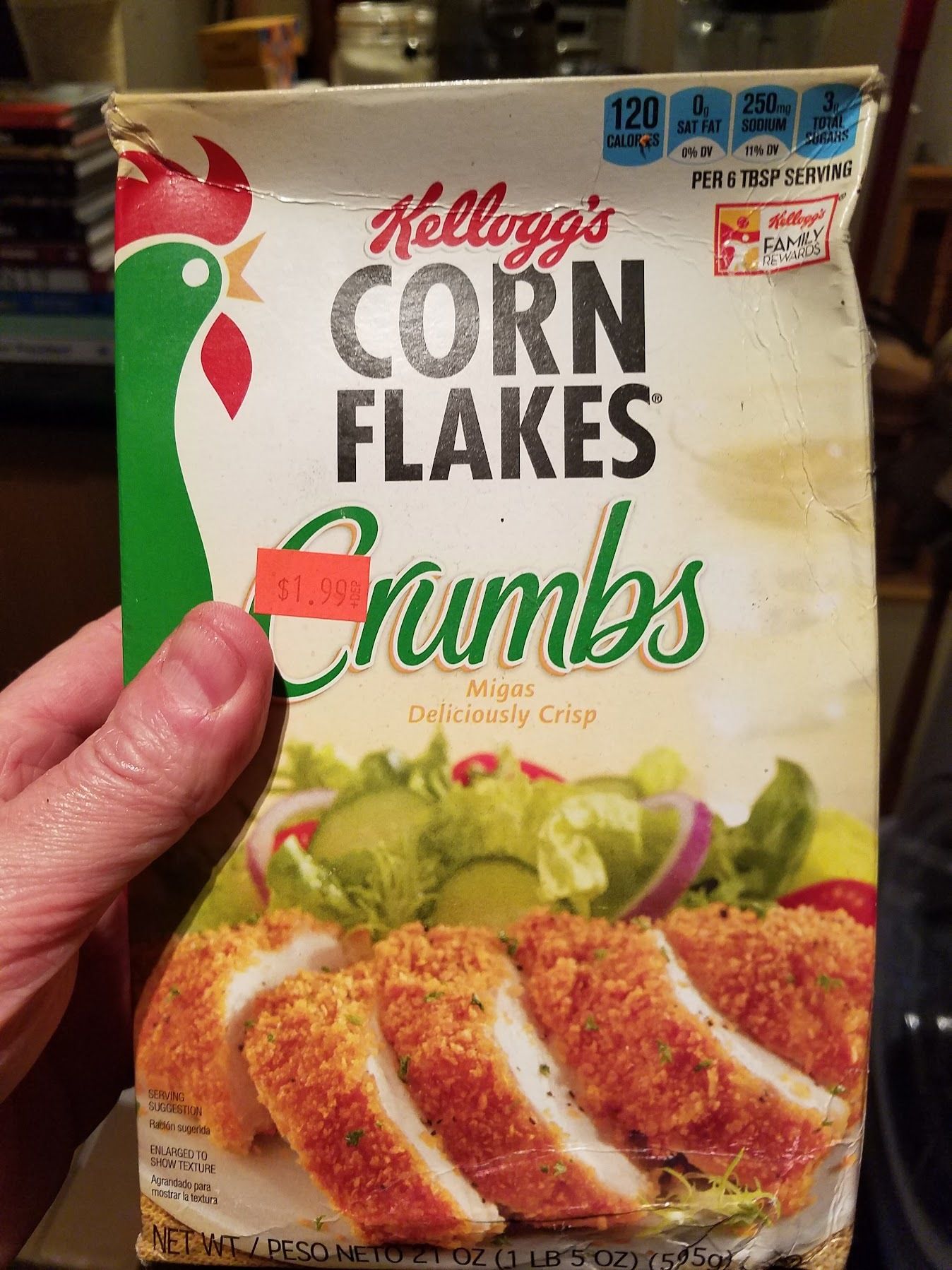 The box was busted up/discolored like this when we bought it but I am not a fussbudget about such things. All those "produce rescue" startups love to brag that they'll sell you like, knobby carrots, would never sell dented cans or dirty cornflake crumbs. And these are good crumbs! Abby went away for a week and I ate like 8 pounds of cornflake-crusted fried tilapia.