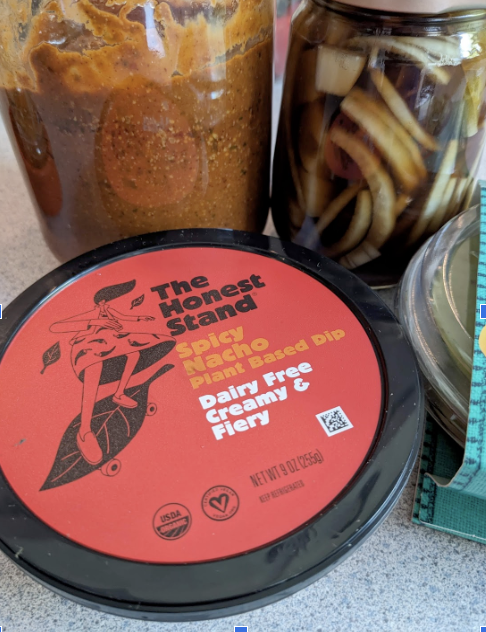 How much respect did I lose for myself by buying this vegan nacho cheese? That I'm allowing my ersatz Papalote salsa and some homemade pickled onions to photobomb says it all. It was strangely compelling, oozy and spicy: 50¢ more than the jackfruit, and 50% more delicious. Maybe the rest will go on a baked potato. Maybe I'll pretend I'm a fussy vegan baby and eat it off a tiny spoon.