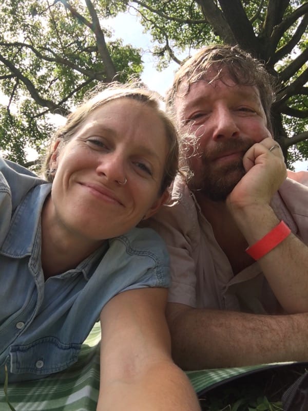 We've been eating intensely too. A couple weeks ago it was the Minnesota State Fair, with things like deep-fried olives and alligator sausage and lobster eclairs. Then yesterday we went to something called Pig Island, a BBQ competition in NYC's most terrible borough. After arriving at noon and washing down 38 kinds of pork with hard cider and key lime martinis, I bought a picnic blanket and we laid down for a snooze. Look how cute: