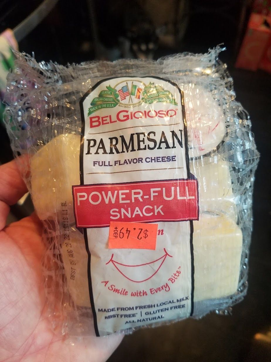 This one is intimidating—it's parmesan, cut into little snack-on-the-go portions like mozzarella or whatever. It sounds too intense for a snack! Raw, unadulterated parm. I dunno. Also why is powerful spelled like that? Can they really guarantee a smile with every bite?
