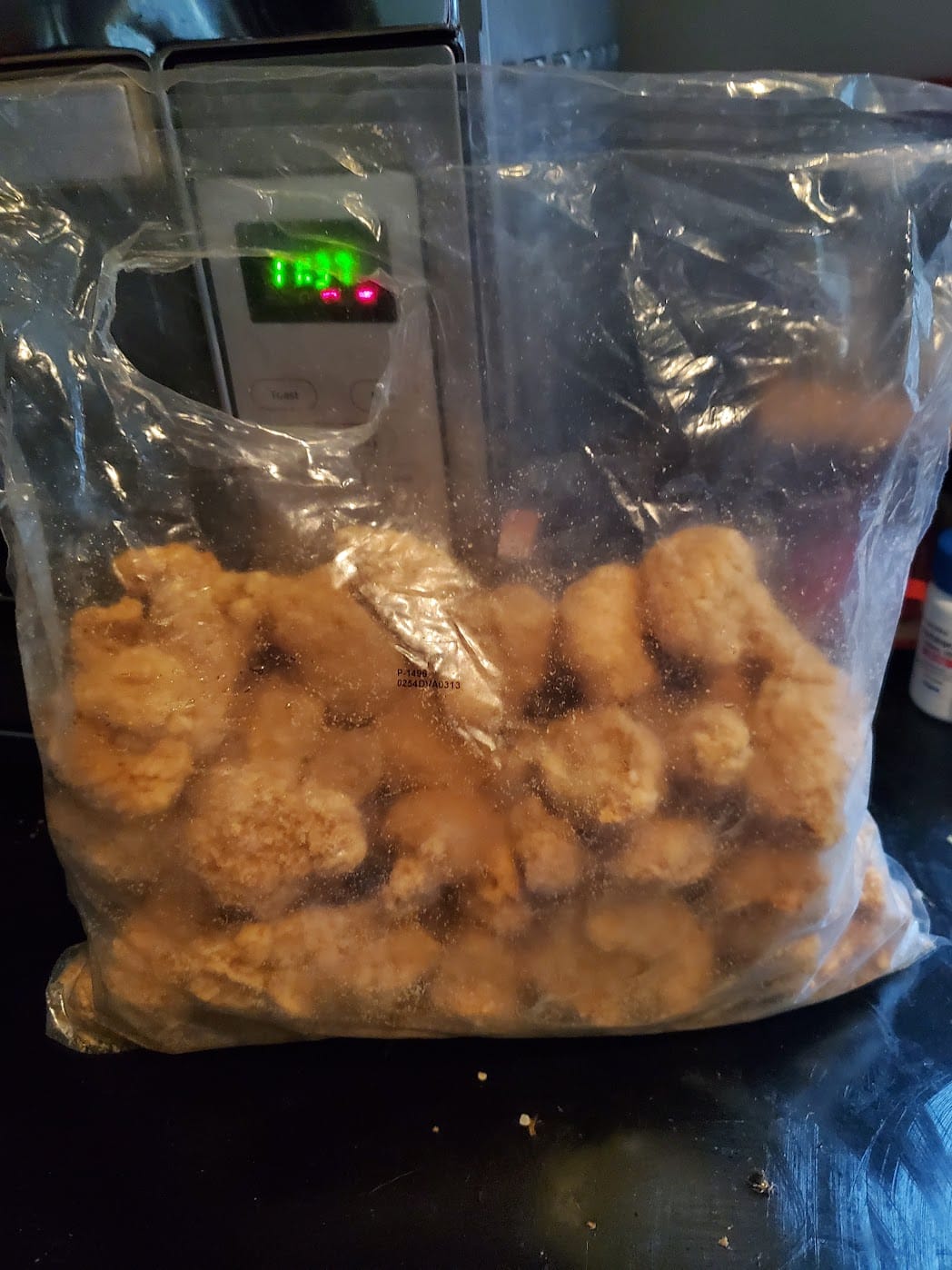 Five-pound, unmarked bag of chicken tendies, allegedly Tyson brand, 1:30 to microwave completion. I'll eat 3-4 tenders before yoga, each dabbed with a bit of ranch. An upgrade from my classic pre-yoga hot dog? Hard to say.