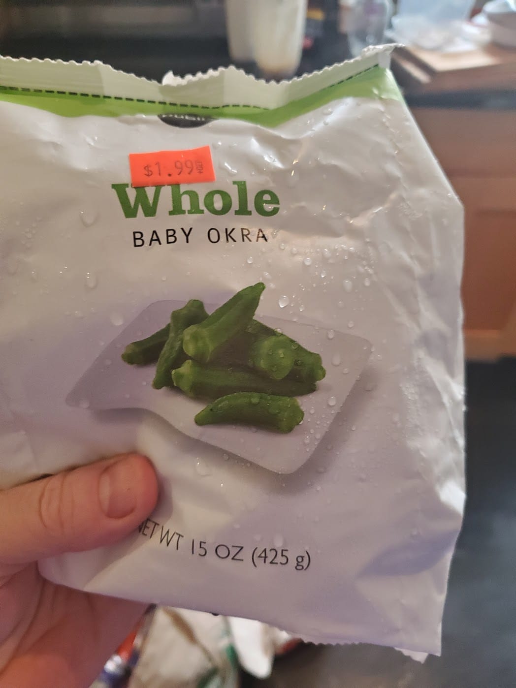 I love that we have a little just-in-case okra stashed in the freezer. Don't love that it comes from this brand.