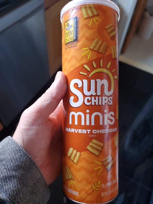 Isn't the point of a Pringle how you can stack a million of them in the tube? This is just a bunch of Sun Chips tossed in there willy nilly. Also they are extra small for some reason. What is going on? (Abby put hers in a little ceramic dish to feel like an aristocrat.)