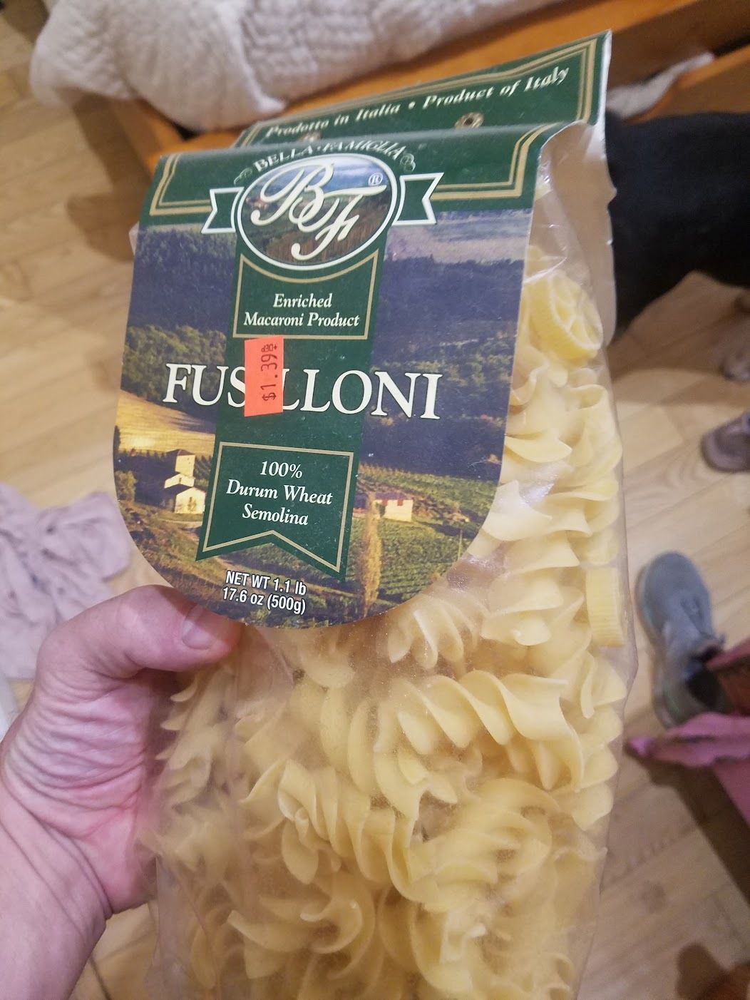 Look in the top right corner of this bag — do you see the cute little pinwheels? A handful of them were mixed in with the Fusilloni, and we're speculating that's why the surplus grocer ended up with these misfits. It's fancy pasta from Italy, after all.