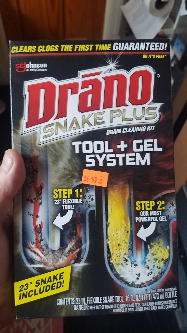 Much like that box of 23 taquitos, this Drano comes with a 23-inch snake. I brought this home and said to Abby, who was working in her bedroom, "I've got an exciting surprise for you!" I wasn't joking either. We have serious drain issues in our apartment. Now we can LARP as plumbers!
