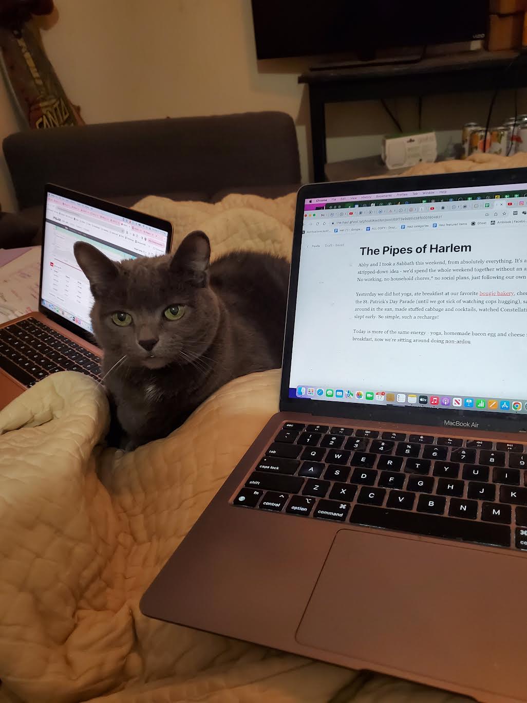 Today was more of the same energy - yoga, homemade bacon/egg/cheese and cold brew, now we're lounging with our cuddlecat, doing non-draining computer stuff (shopping, reading good things, writing The Haul).