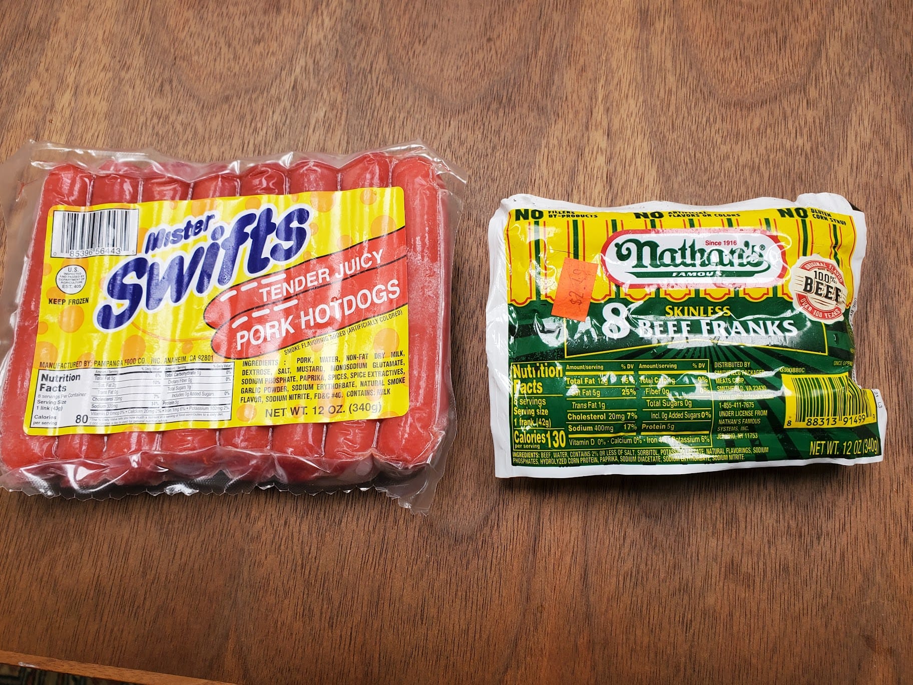 Nathan's hot dogs typically go for $8 a package (!), so Dylan got a premium-but-common product. I, on the other hand, get to sample a new global wiener. Legend has it that Mister Swifts are lightly sweet - I'm gonna make spaghetti!
