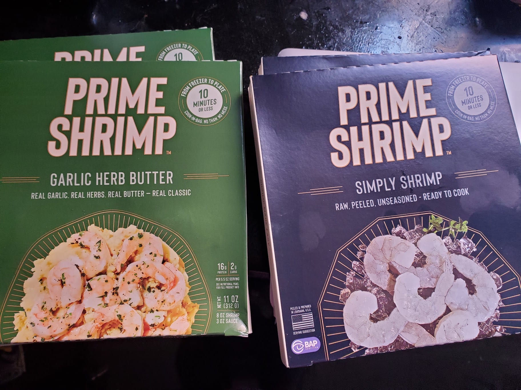 Typically the store only gets big bags of uncooked shrimp, 5 pounds or bigger. These are unwieldy, and require more freezer space than we ever have. Thus we were very jazzed to find these semi-flat 11-oz packages, perfect for skinny freezer nooks. Abby dubbed them the Book of Shrimp.