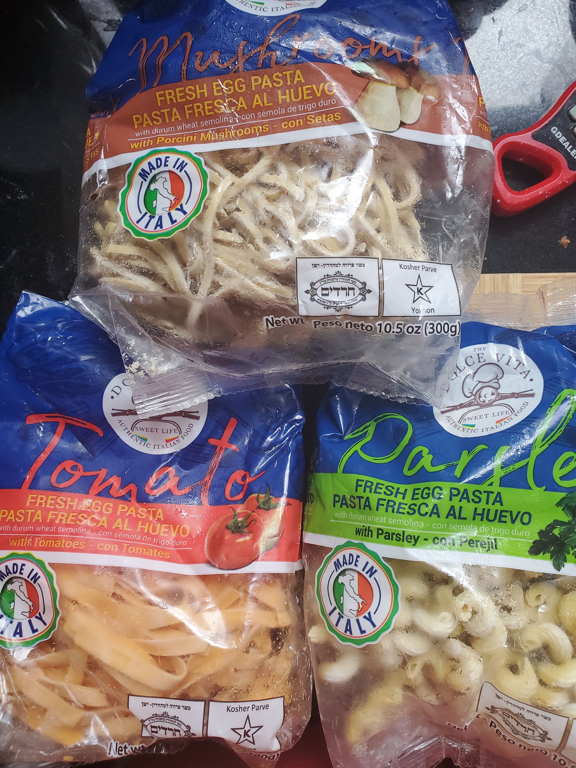 Every time we try to winnow down our hoarder freezer, the surplus grocer gets something new and magical. This time it was an entire line of imported fresh pastas, all of them unique and fascinating. I only put 3 bags in the picture but I think we bought 8. Sorry to next week's petsitters: The freezer is now a hazard.
